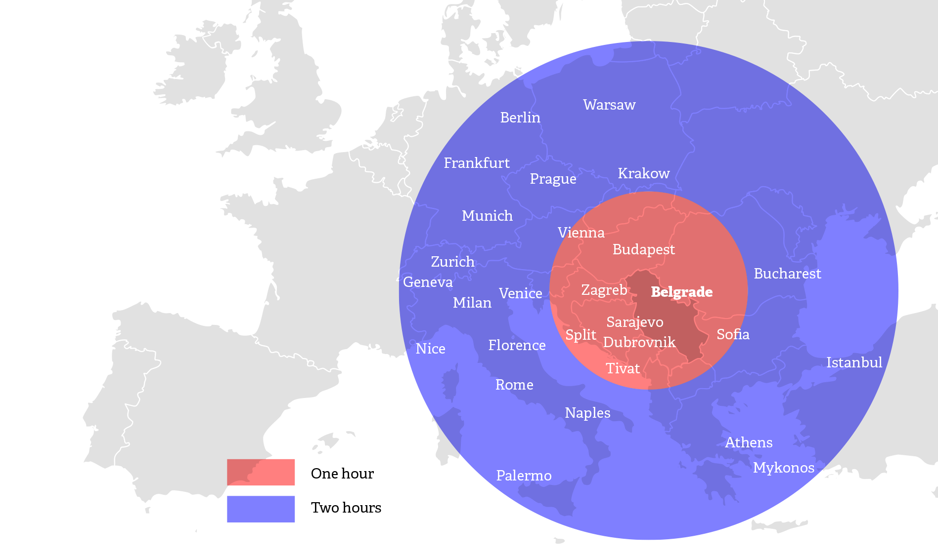 The Adriatic coast of Croatia and Montenegro is an hour away. The Greek Islands, the Swiss and Austrian Alps, the beer halls of Prague and Munich, the French and Italian Rivieras, the nightclubs of Berlin, the fashion houses of Rome and Milan, the canals of Venice, and the Grand Bazaar of Istanbul are all within two hours of Belgrade.